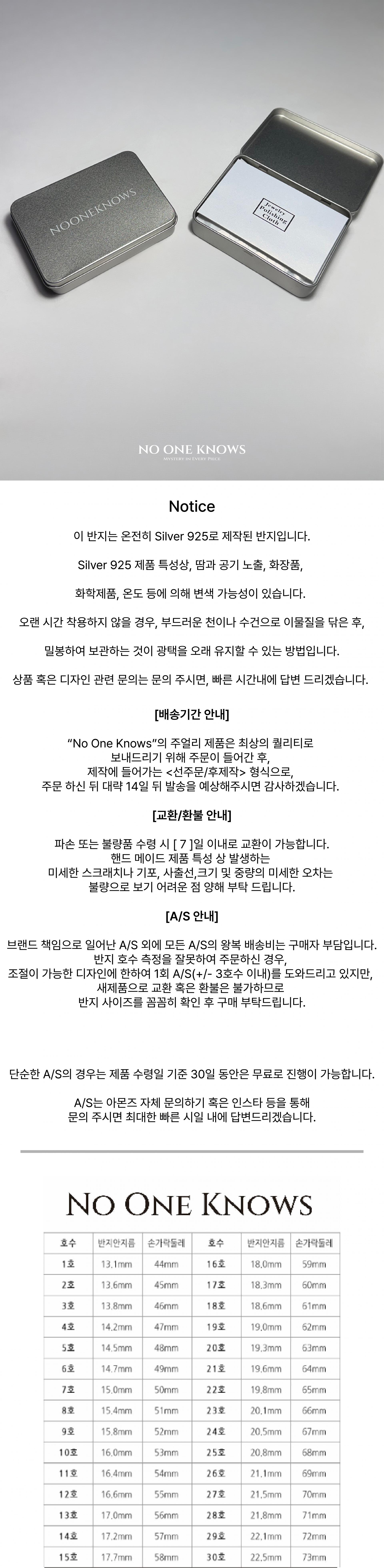 -"No One Knows"의 주얼리 제품은 주문이 들어간 후, 제작에 들어가는 <선주문 / 후제작> 형식으로, 주문 하신 뒤, 대략 14일 뒤 발송을
